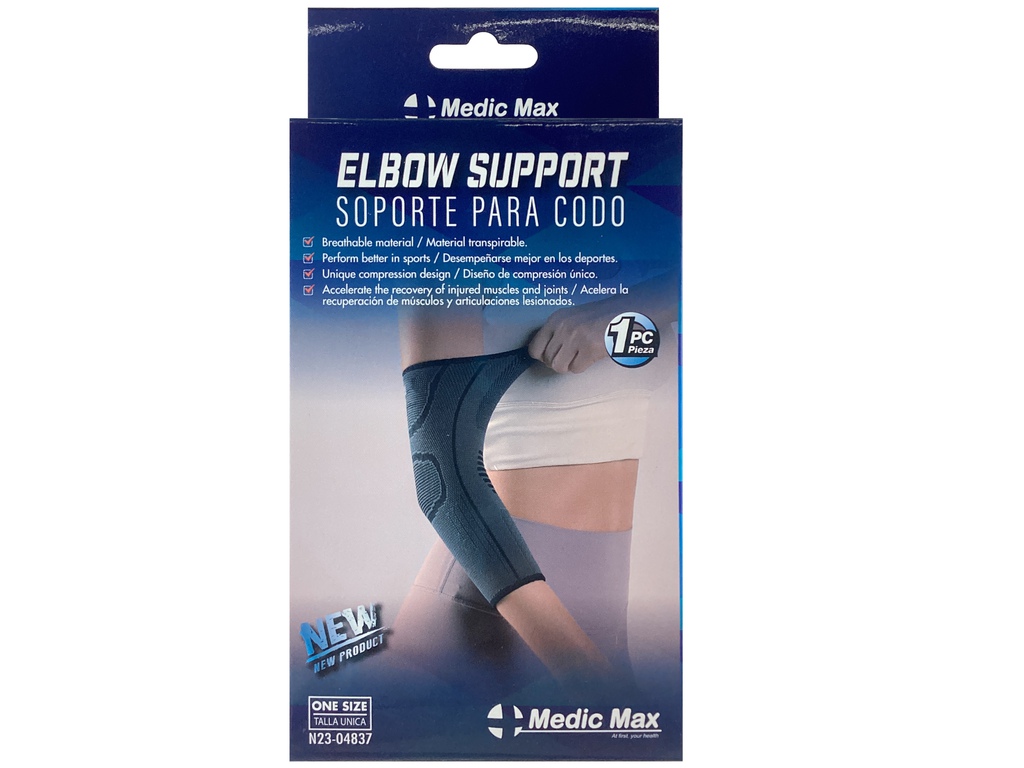 El Soporte de codo Medic Max unitalla, color negro, está diseñado para proporcionar alivio y soporte al codo, reduciendo el dolor y la tensión. Su diseño ergonómico y transpirable se adapta a la forma del codo, ofreciendo comodidad y soporte durante todo el día. Ideal para personas que sufren de epicondilitis, tendinitis de codo o dolor debido a actividades repetitivas.